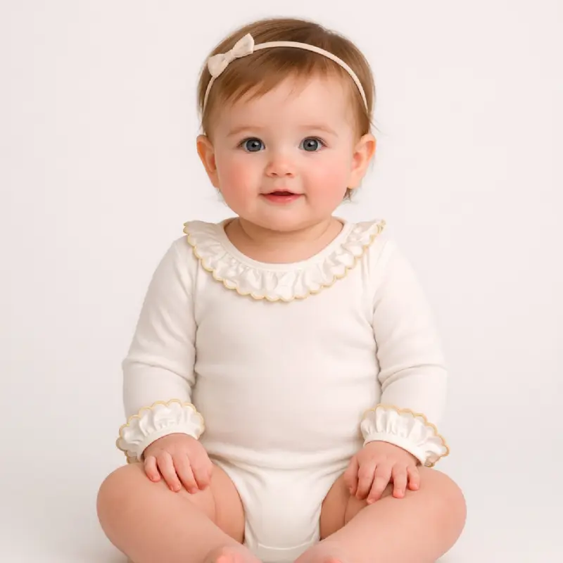 Camisa bebé de batista beige 100% algodón, suave y transpirable, ideal para piel delicada. Manga larga con cuello volante y diseño elegante. Perfecta para el día a día o ocasiones especiales. Disponible en talla 9 meses.