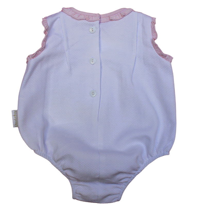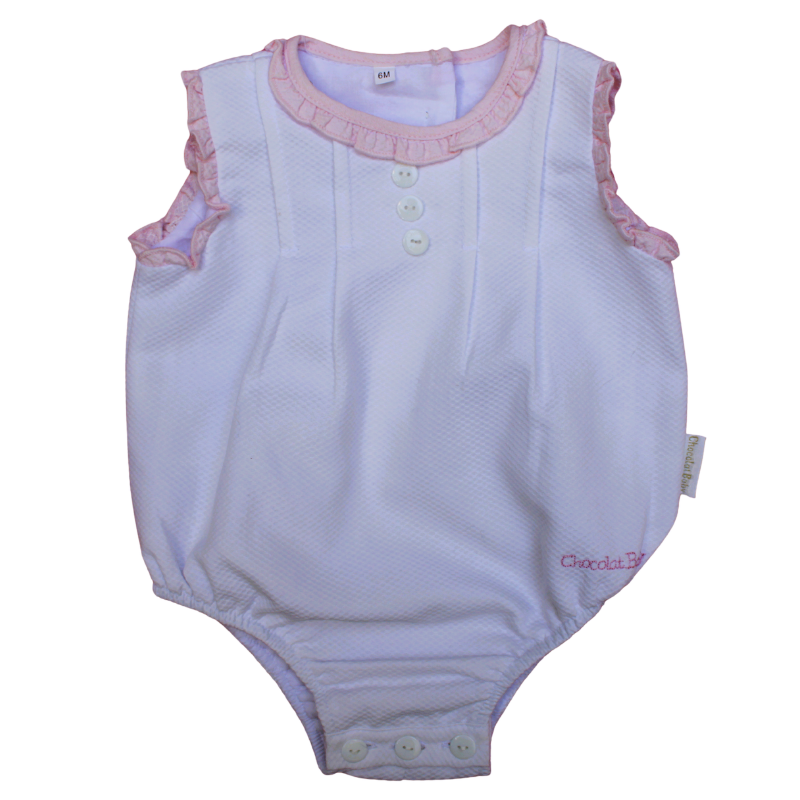 Enterizo plisado de color blanco para bebé de la marca Chocolat Baby. Diseño elegante y clásico con detalles de volantes rosas en el cuello y en las sisas. Adornando con tres botones blancos. El cierre es abotonado por detrás. Confeccionado en suave tela que brinda comodidad y estilo.
