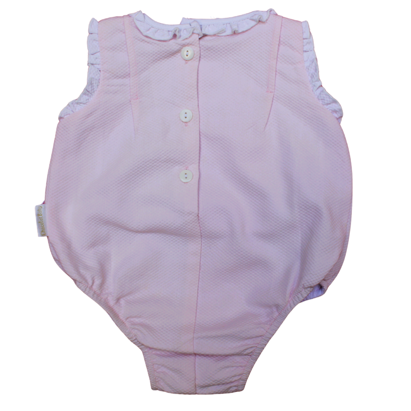 Enterizo plisado de color rosa para bebé de 6 meses de la marca Chocolat Baby. Diseño elegante y clásico con detalles de volantes en el cuello y adorno de botones delanteros. El cierre es abotonado por detrás. Confeccionado en suave tela que brinda comodidad y estilo.