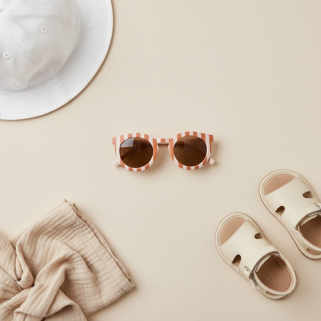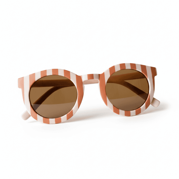 Gafas de sol para niños con protección UV400, diseño rayado en tonos rosa suave y camel. Ligeras, cómodas y seguras, ideales para proteger los ojos de los más pequeños del sol durante paseos y actividades al aire libre.