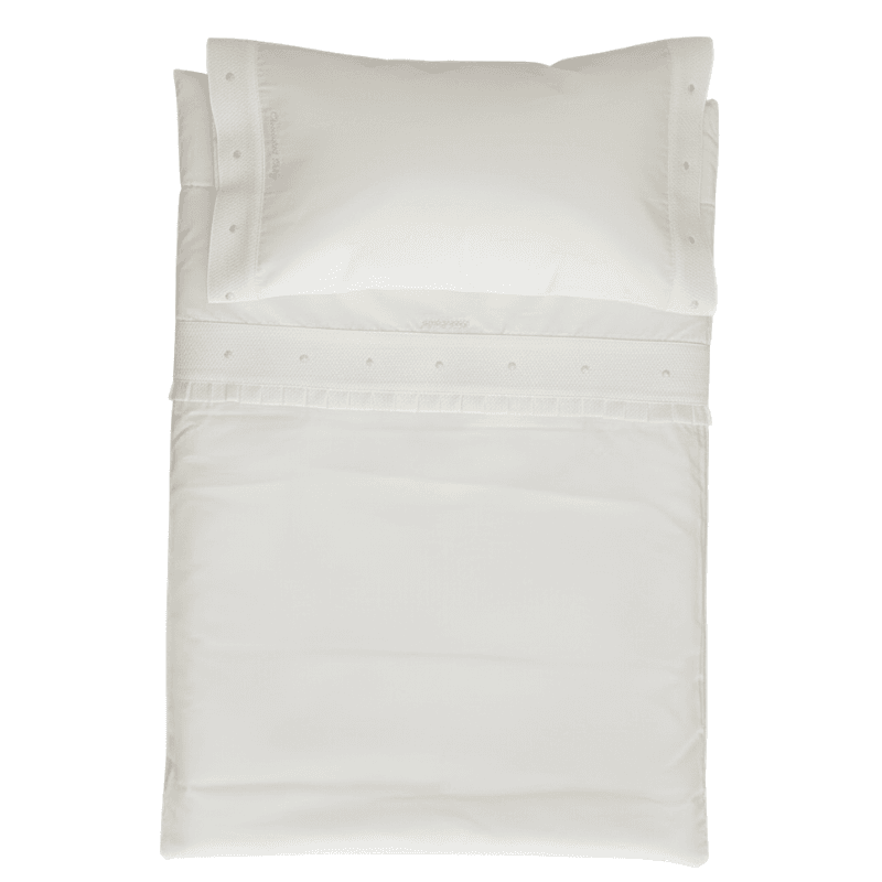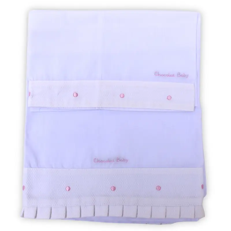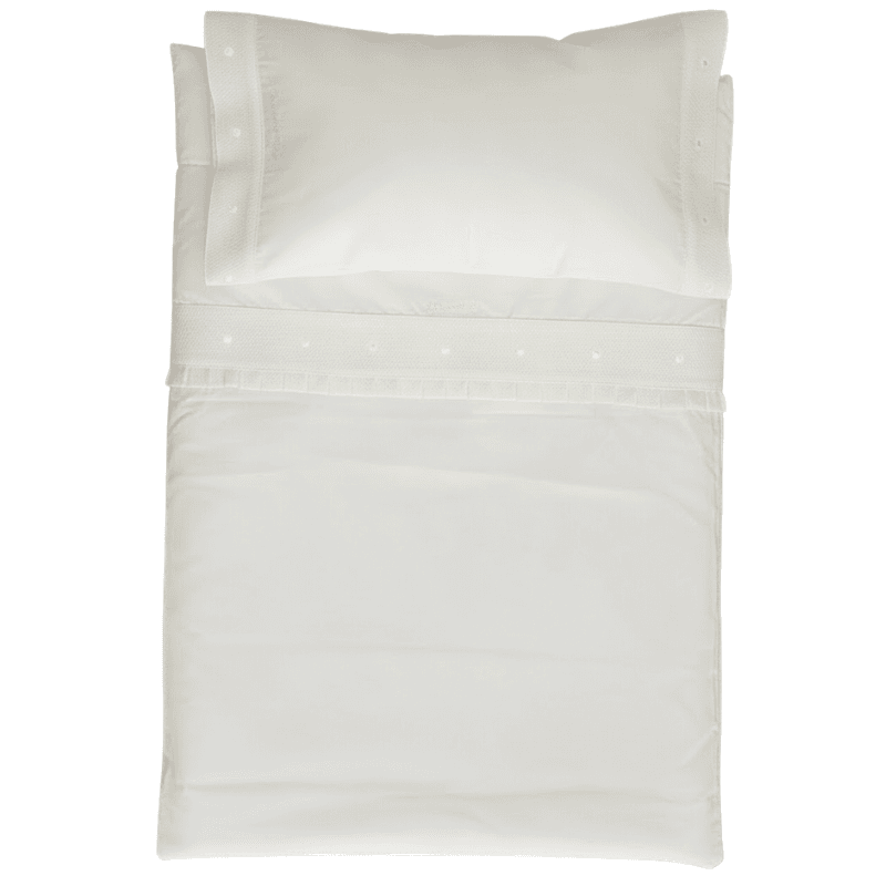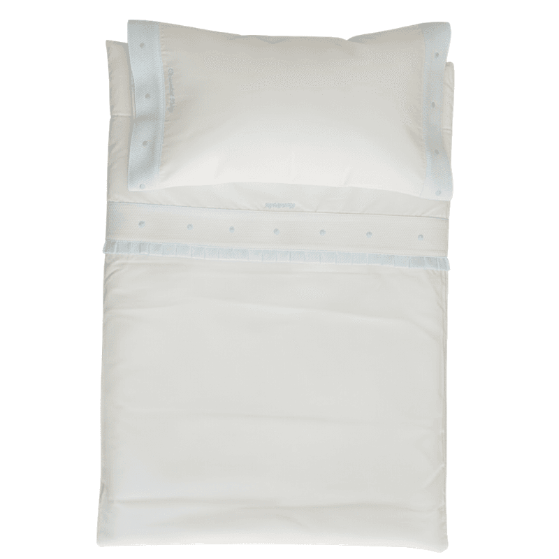 Confeccionado en tejido suave y agradable al tacto, este conjunto destaca por sus delicados detalles decorativos en el embozo, que aportan un acabado elegante y cuidado. Incorpora una banda decorativa en tejido tipo piqué con pequeños detalles bordados, así como un fino remate plisado que realza su estilo clásico.