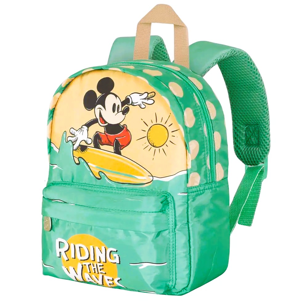 Mochila ligera preescolar Disney Mickey Mouse Surf en verde y amarillo. Con estampado de Mickey surfeando, bolsillo frontal con “Riding the Waves” y espalda acolchada.