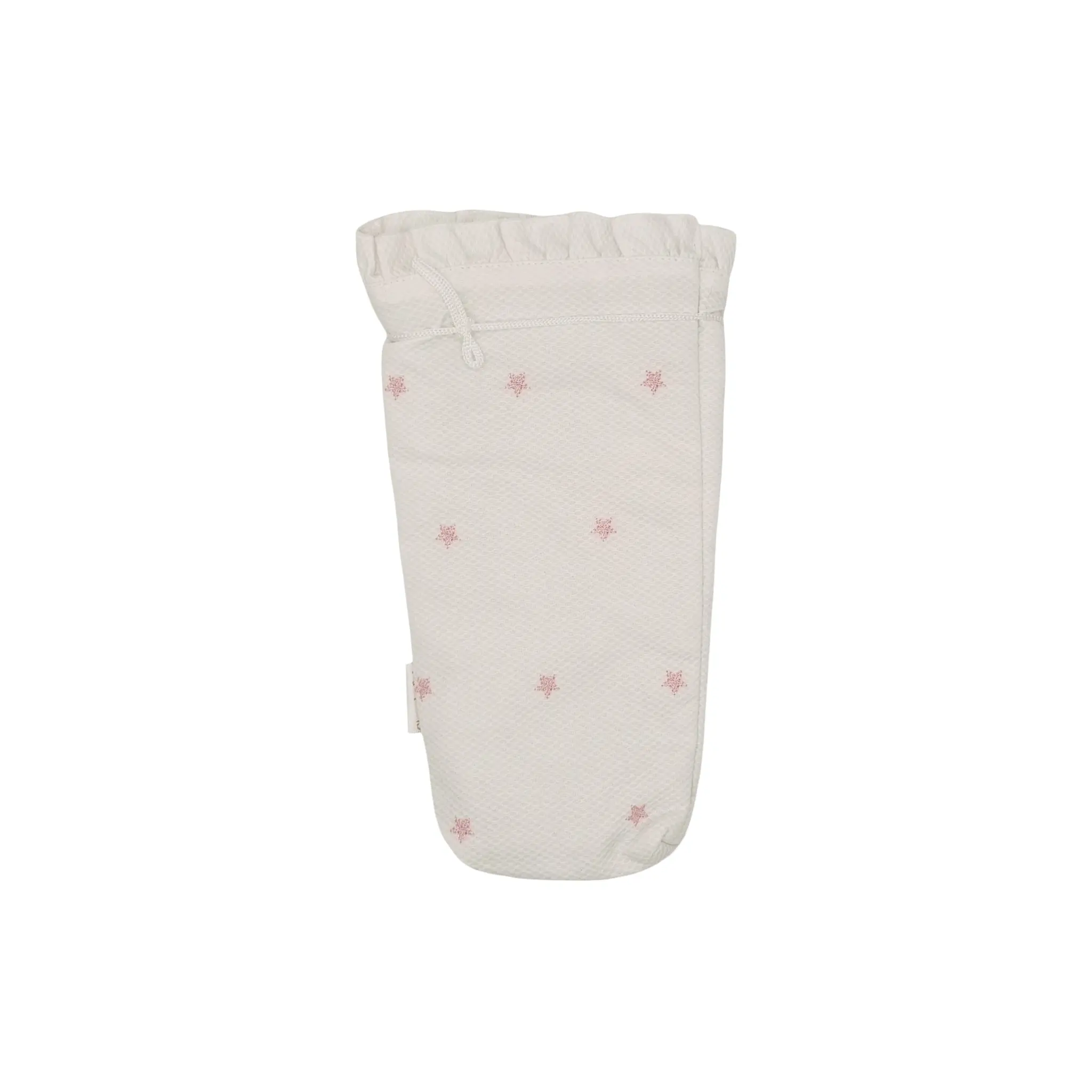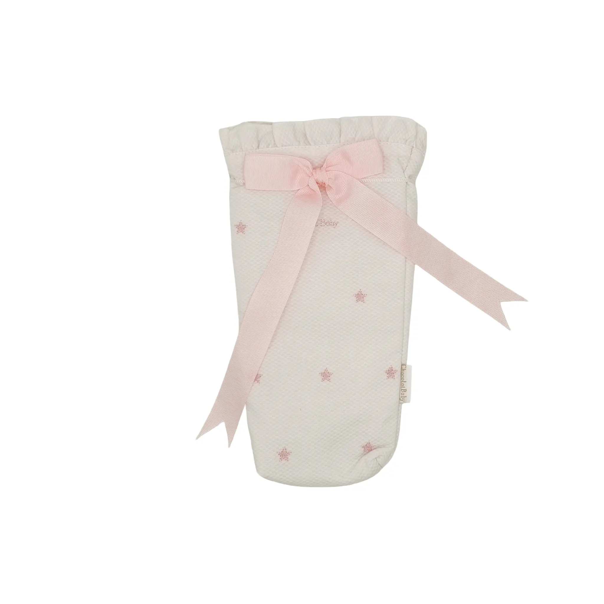 Portabiberón de tela blanca con estrellas bordadas en rosa, decorado con un lazo del mismo color. Un accesorio práctico y delicado, ideal para transportar el biberón del bebé con comodidad y mantenerlo protegido.