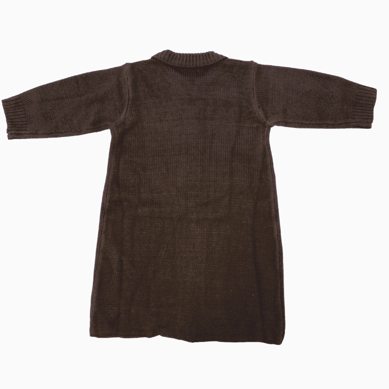 De color gris marengo, tiene un diseño clásico con trenzas verticales en la parte delantera y botones en la zona superior, que permiten vestir al bebé fácilmente.