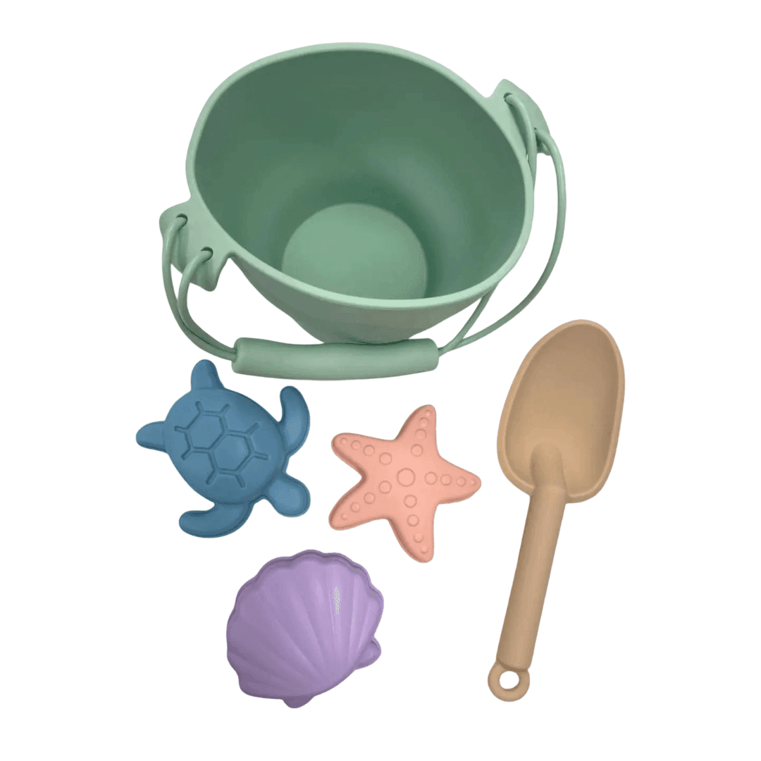 Incluye todo lo necesario para disfrutar de un magnífico día en la playa: un cubo, una pala y moldes con formas de animales marinos. Está fabricado con materiales seguros, duraderos y libres de BPA, ideal para manos pequeñas.