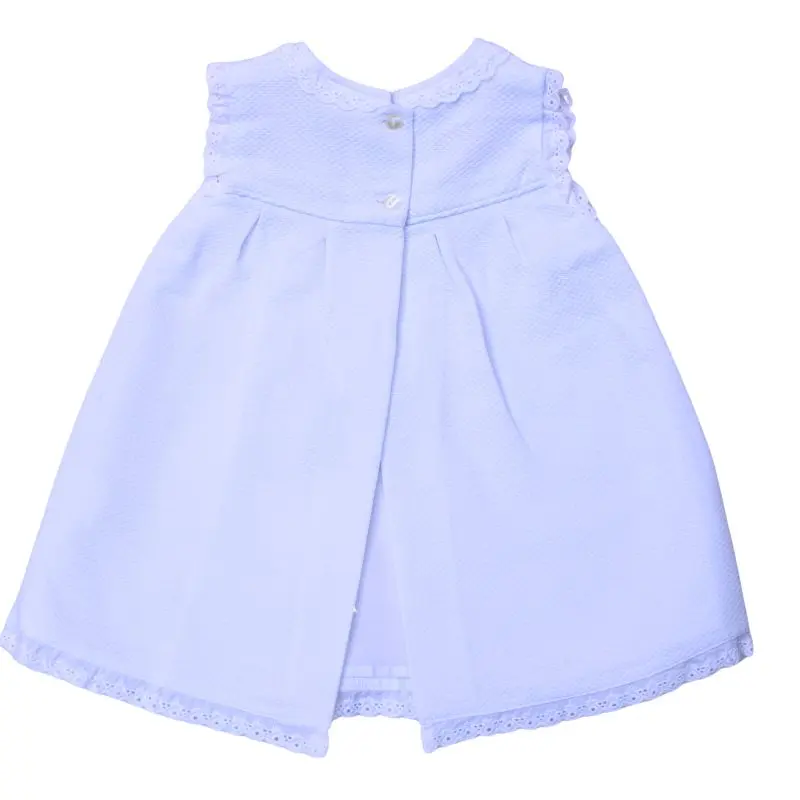 El diseño destaca por sus detalles bordados en tono dorado en la parte frontal, que aportan un estilo delicado y refinado. Incorpora pliegues suaves que dan amplitud al vestido, así como un fino remate de puntilla bordada en cuello, sisas y bajo. Cuenta con forro interior para mayor confort y apertura trasera abotonada, facilitando el vestido y desvestido del bebé.