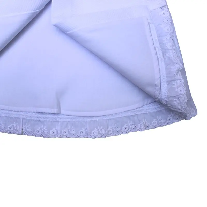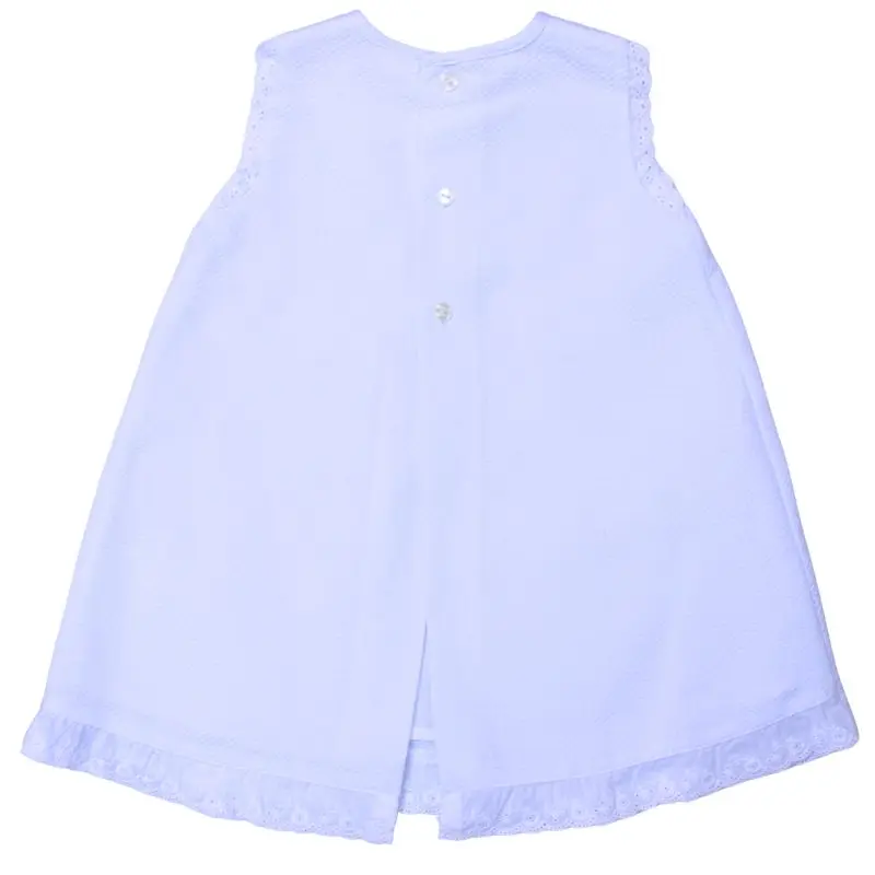 El diseño destaca por sus delicados detalles de bodoques en la parte frontal y un fino remate de puntilla bordada en cuello, sisas y bajo, que aportan un estilo clásico y refinado. Incorpora forro interior para mayor confort y una apertura trasera abotonada, facilitando el vestido y desvestido del bebé.