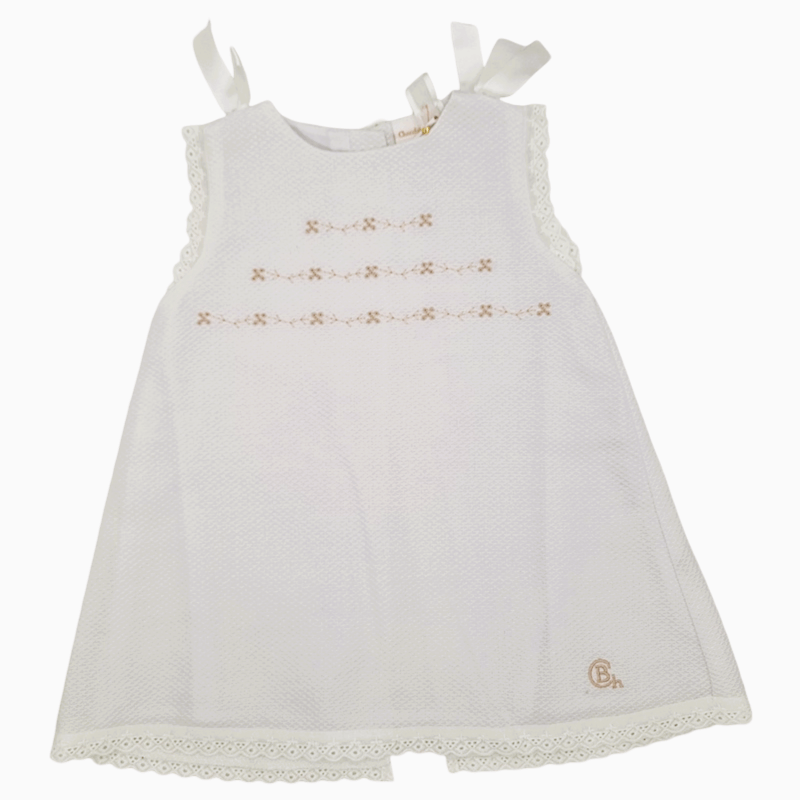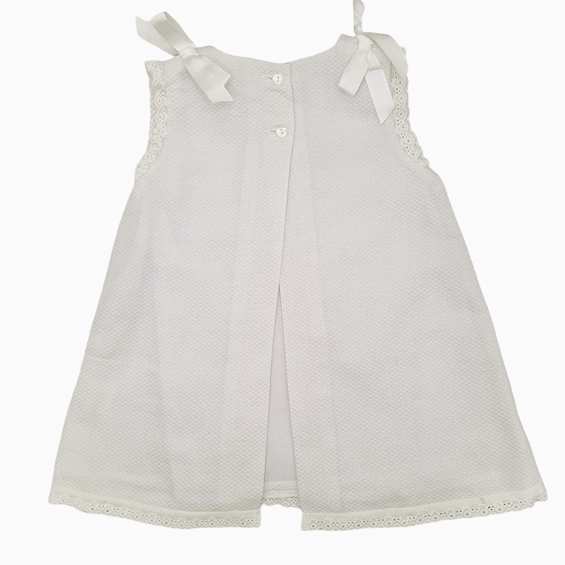 Vestido de bebé niña Chocolat Baby de piqué blanco bordado y forrado. Apertura trasera abotonada.